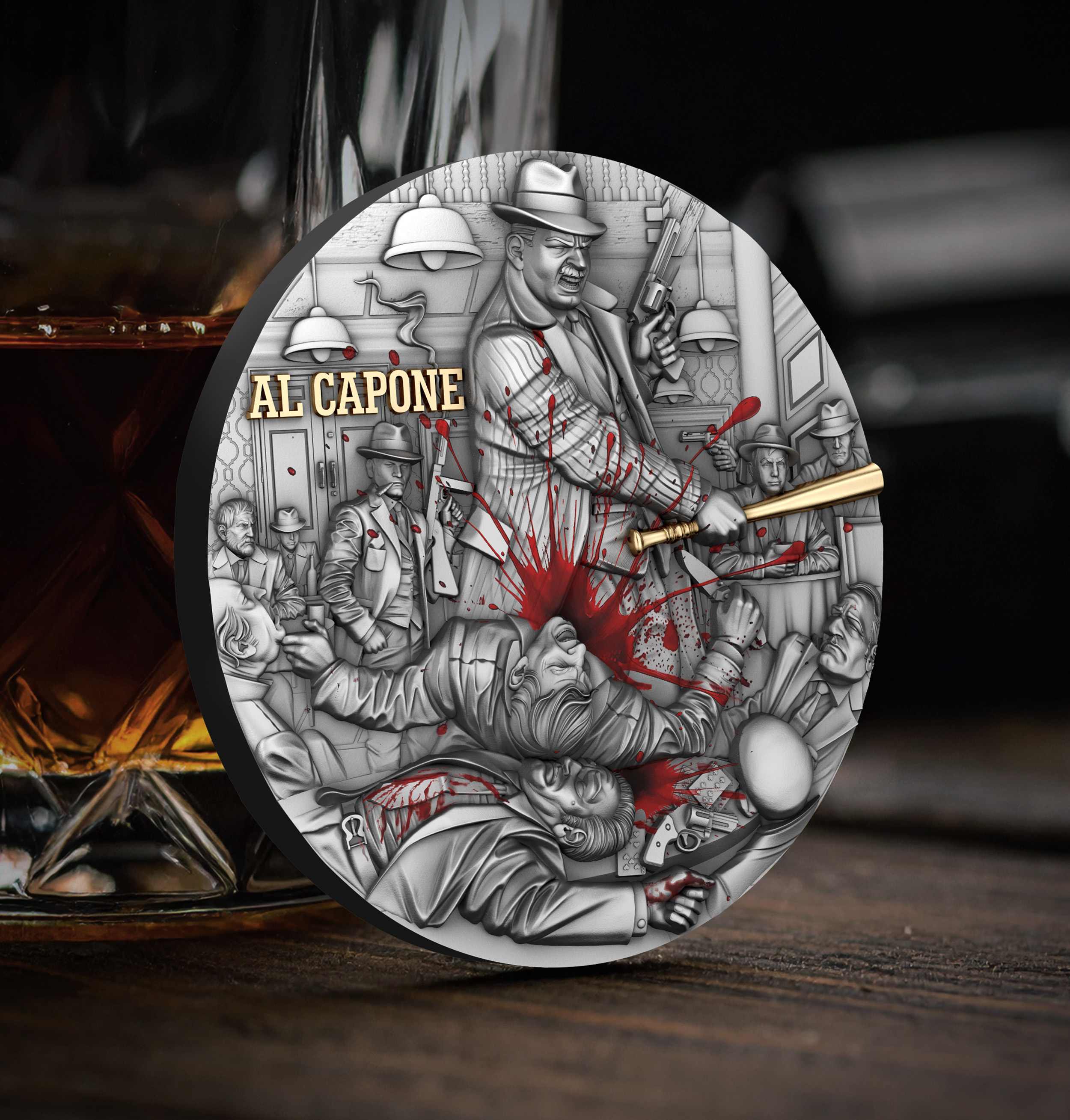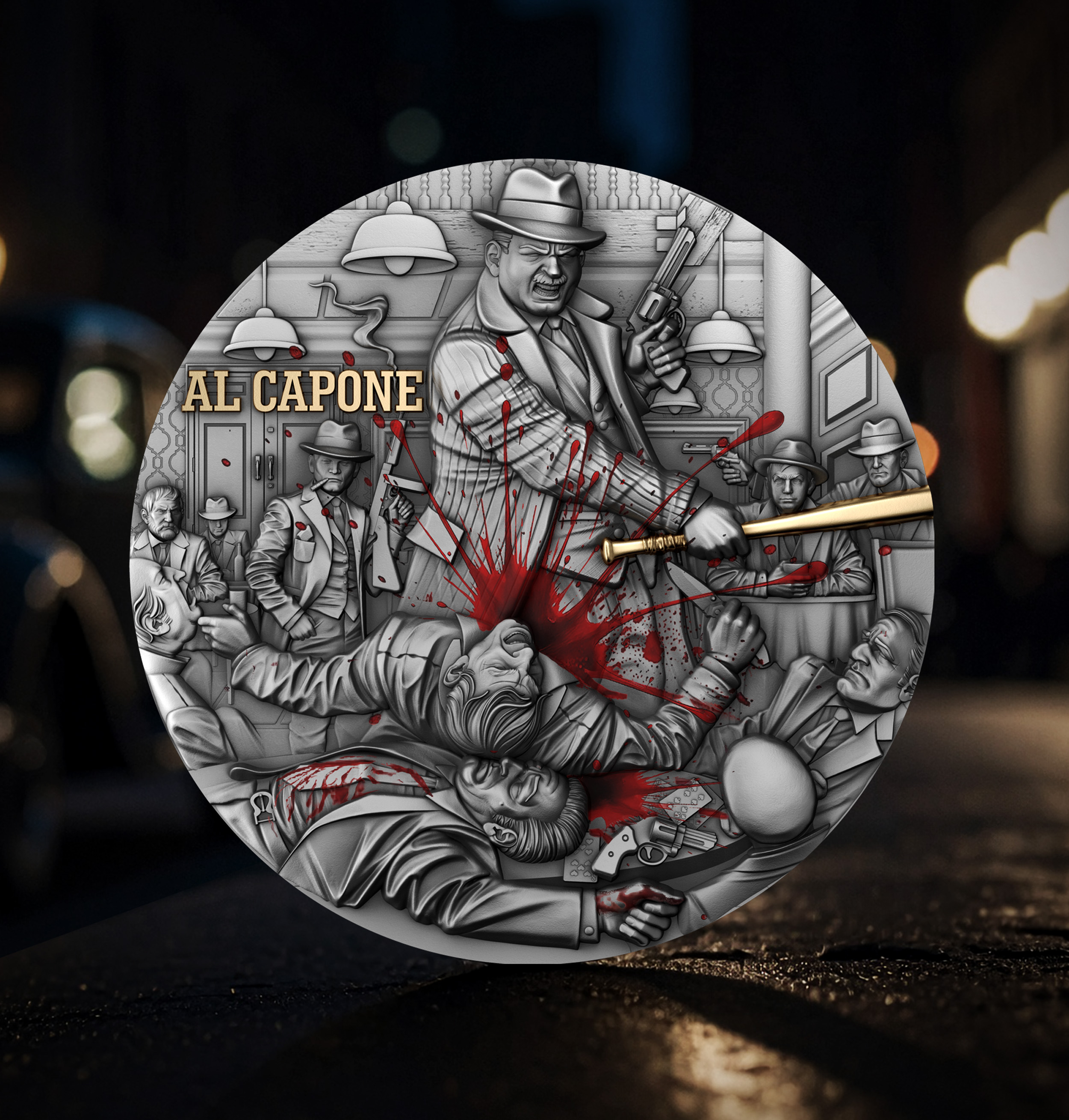 Every figure, shadow, and movement is captured with sculptural precision — from the tailored suits to the splattered blood, rendered in dramatic red enamel.