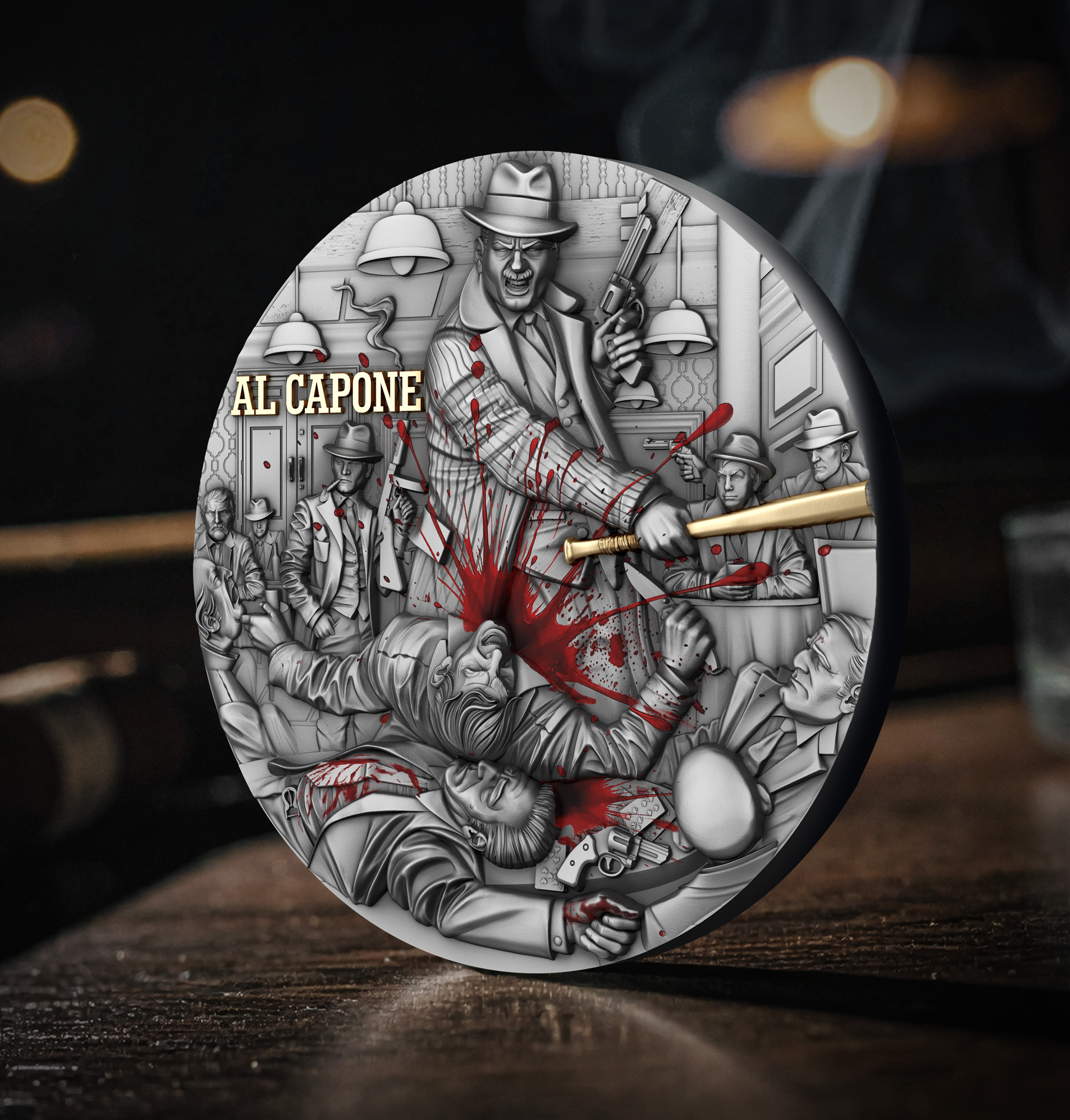 Capone stands at the center, gripping a golden bat mid-strike, his expression cold and controlled. Around him, chaos unfolds: men fall, the room erupts, and fear takes shape in silver relief.