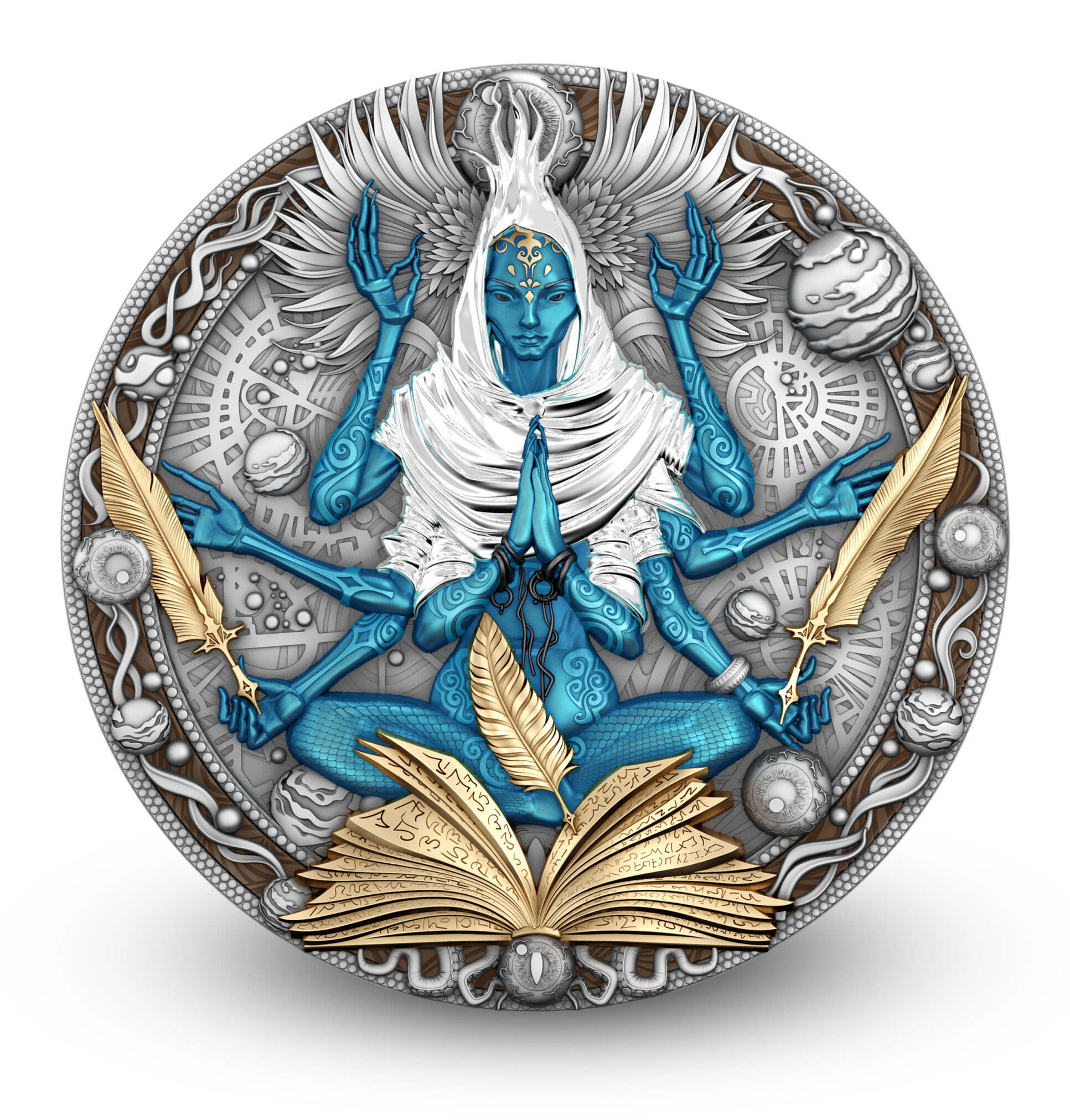 high relief captures the intricate form of Cobellian, selective gilding emphasizes his divine presence, and UV printing reveals cosmic depth across the design.