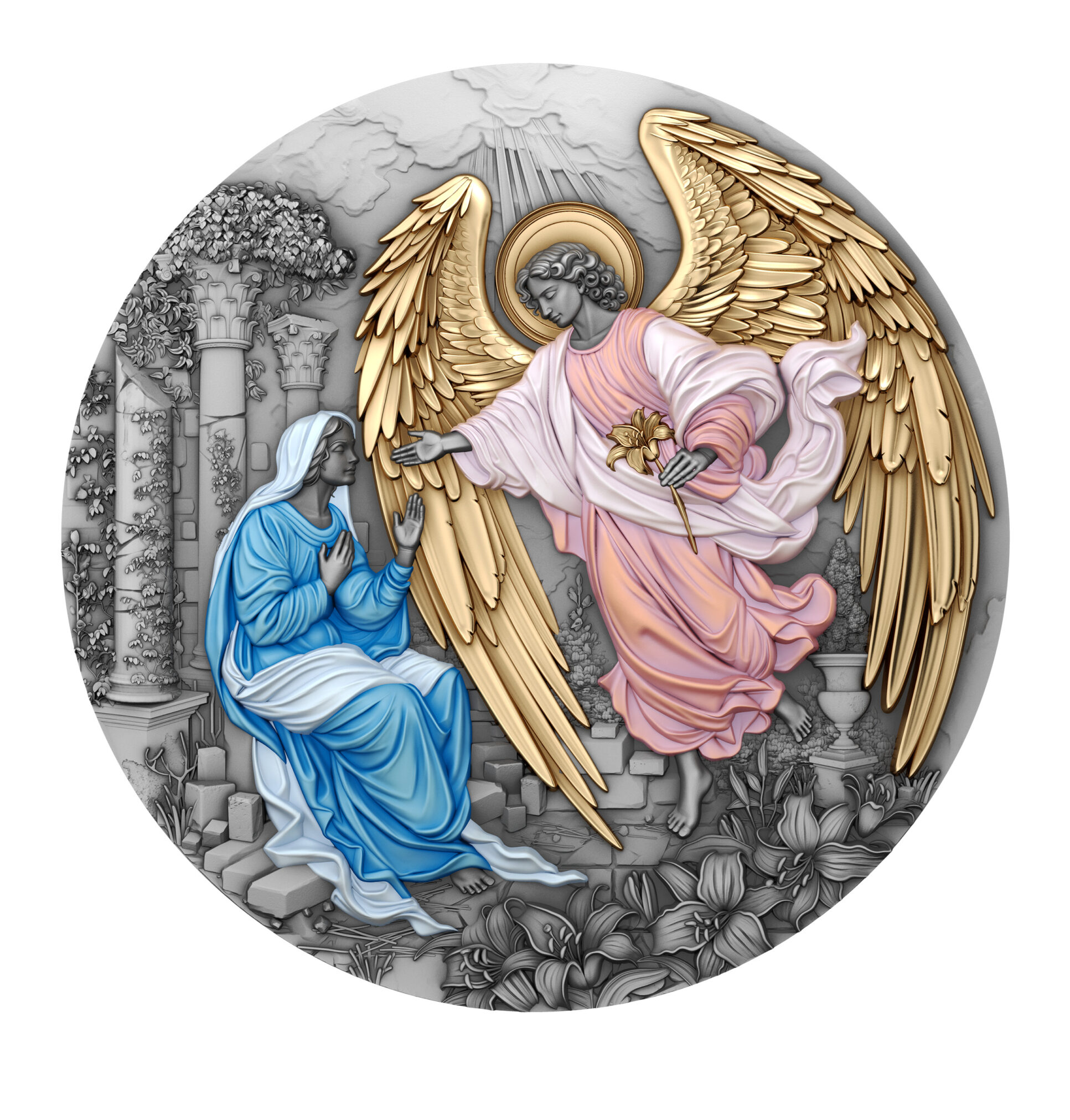 This silver collectible coin captures that tender, sacred moment: Mary, filled with humility and quiet faith, receives God’s word.