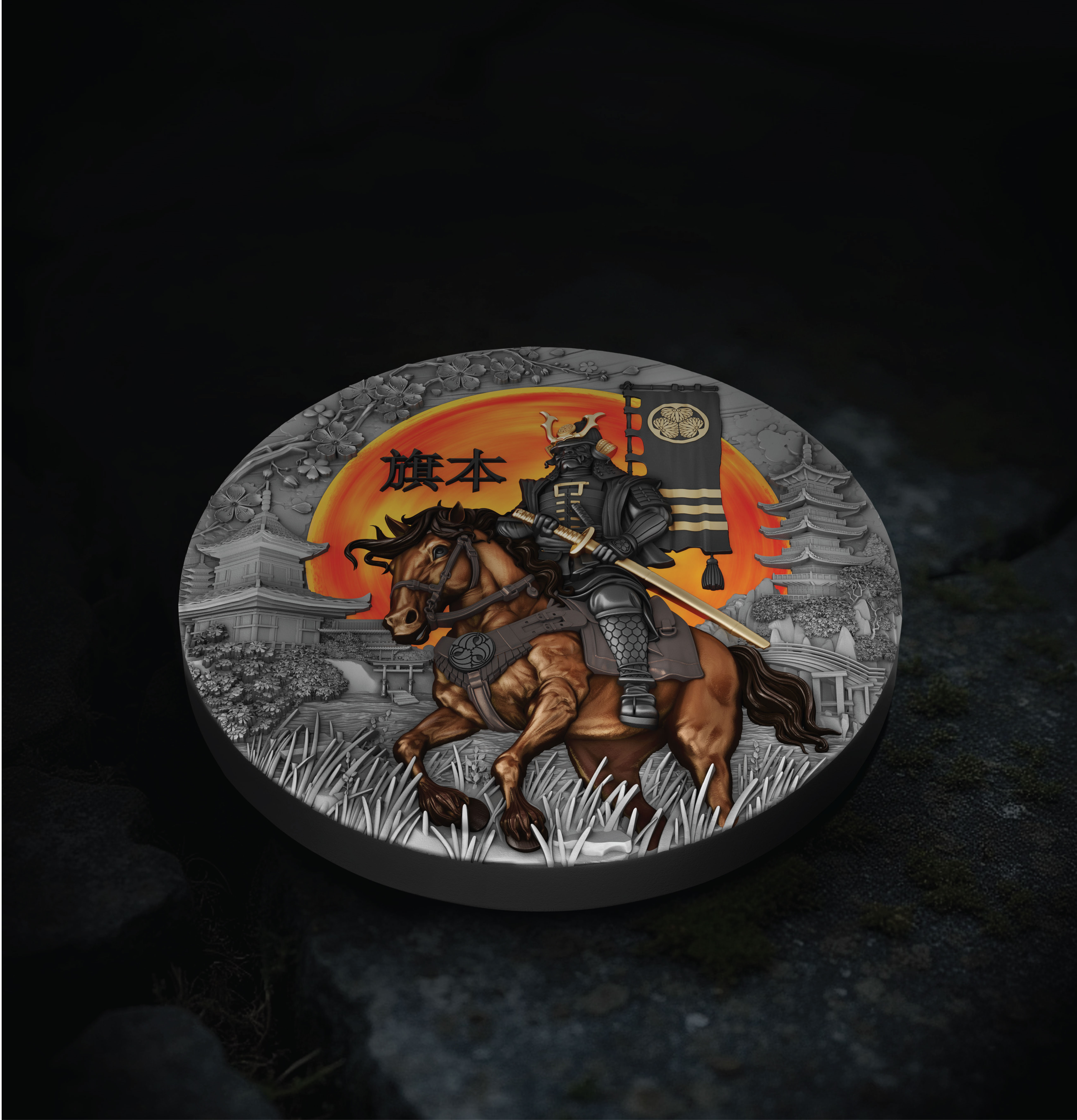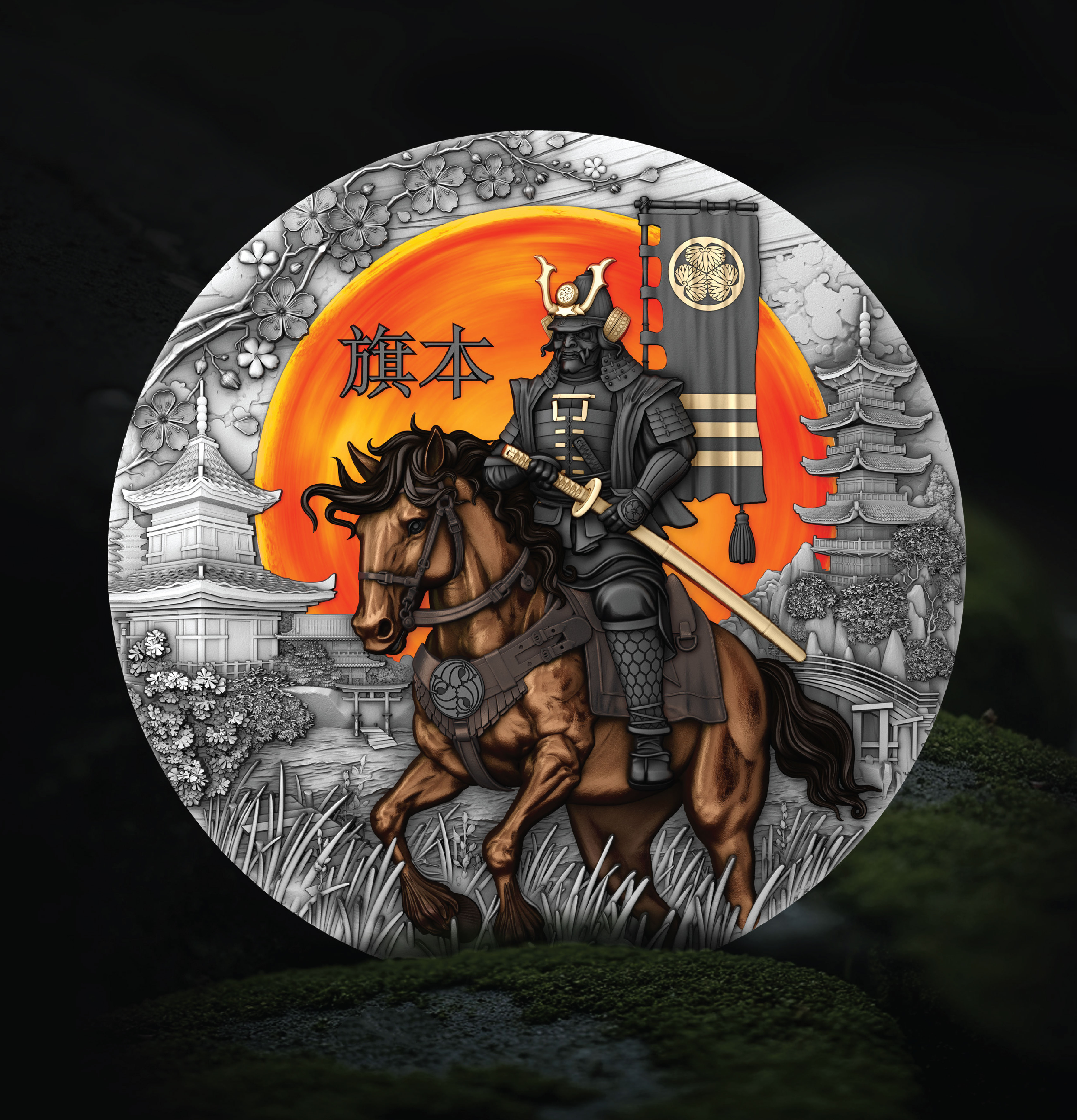 In ancient Japan, the Hatamoto stood as the daimyo’s closest warrior – a symbol of absolute loyalty, courage, and discipline. On this remarkable coin, he is portrayed as a timeless icon of honor: mounted on a noble horse, clad in black armor with golden accents, his war mask transforming him into the eternal spirit of battle.