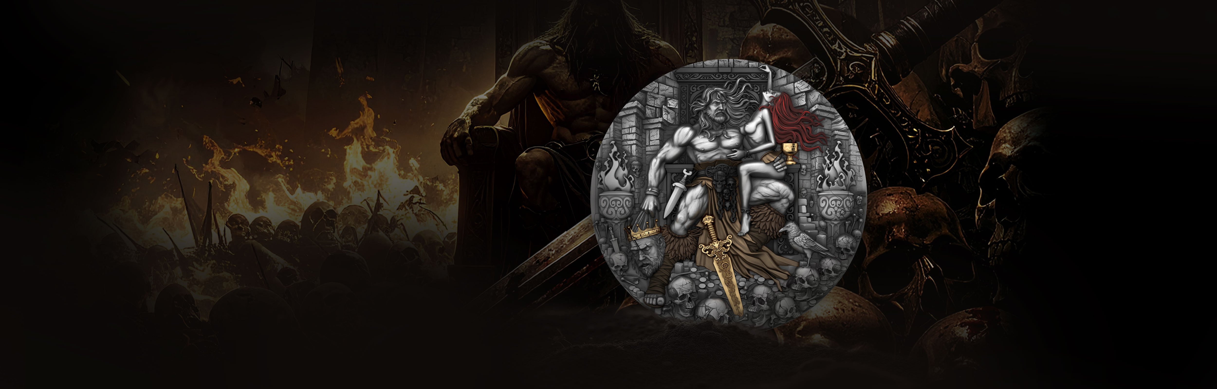T&S Coin’s latest two-ounce silver release, Barbarian King, brings this archetype to life in striking detail. The coin portrays a classic warrior — a towering, battle-scarred figure holding a red-haired woman in one hand and a severed head in the other. Skulls scatter the ground, and a broad gilded sword gleams in the foreground. It’s bold, unapologetic, and unmistakably barbaric. Fans of the genre will recognize the nods to Robert E. Howard’s Conan universe, including the Red Sonja-inspired companion.