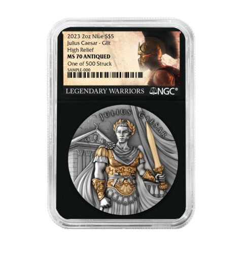 Pinehurst Coins announces the release of the second coin in its Legendary Warrior series, Julius Caesar. This newest member of the series is a 2 oz Gilded and Antiqued $5 Coin of .999 fine Silver. The coin commemorates one of Roman history’s most noted but not beloved leaders. The root of that distinction is attributed to his merciless and aggressive nature toward his opponents both in battle and politics. His death, at the hands of approximately 40 Roman Senators, led to the demise of the Roman Republic and the rise of the Roman Empire. Beyond his military and political achievements, Julius Caesar is also renowned for his orations and prose.